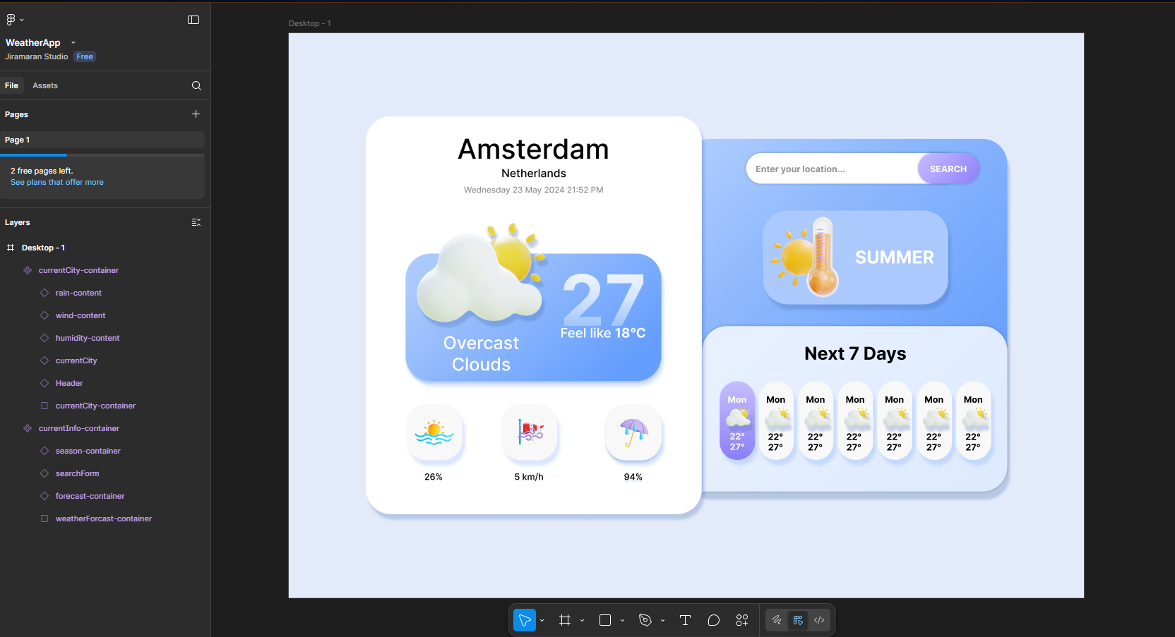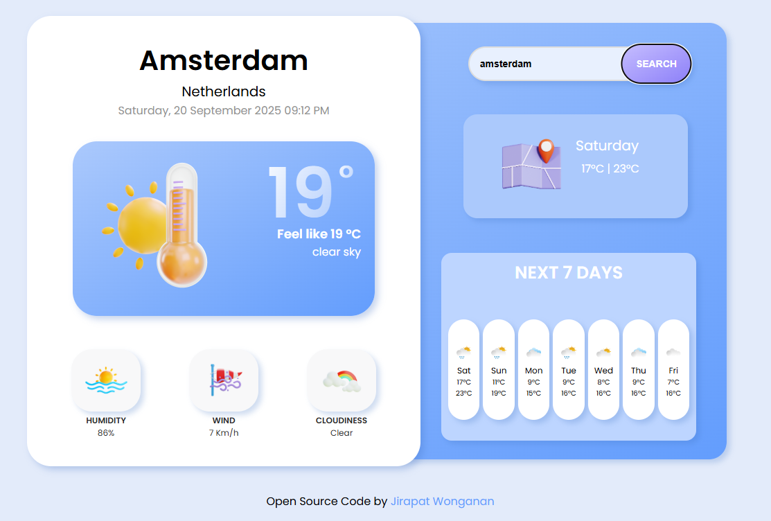 - Integrated the SheCodes Weather API to fetch live temperature, humidity, wind speed, and weather conditions.