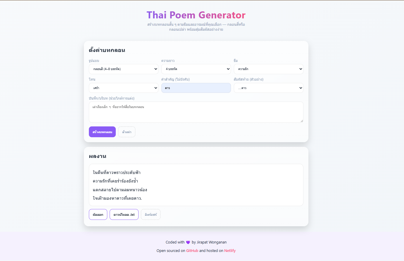 - Generates Thai poems in real-time using the SheCodes AI API.